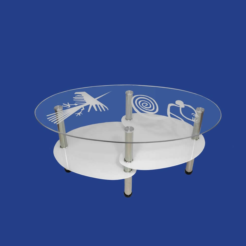 Mesa de centro con estilo moderno figura de las lineas de nazca, doble espacio, material de aluminio, vidrio templado resistente y fácil de limpiar. Ventas al por mayor a partir de 10 unidades, precios con descuentos a partir de 2 a más productos.